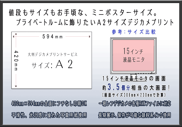 - デスクサイドに飾れるお手軽サイズのデジカメプリントサービス。A3からA4まで。とりあえず、お手軽な値段で大判サイズを愉しみたい、というお客様にはA3サイズがお勧めです。