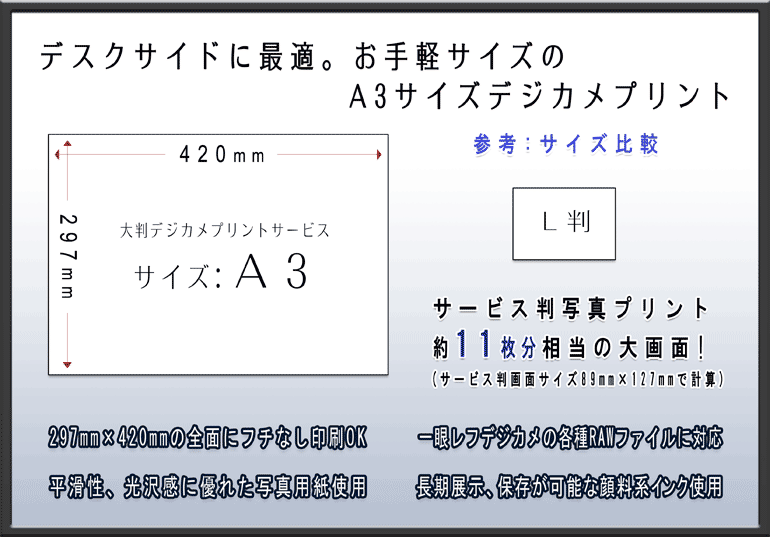 - デスクサイドに飾れるお手軽サイズのデジカメプリントサービス。A3からA4まで。とりあえず、お手軽な値段で大判サイズを愉しみたい、というお客様にはA3サイズがお勧めです。