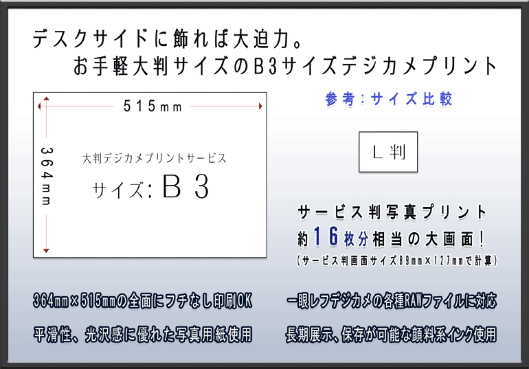 このページでは、B3サイズ(364mm×515mm)の大判デジカメプリントサービスをご案内します |
