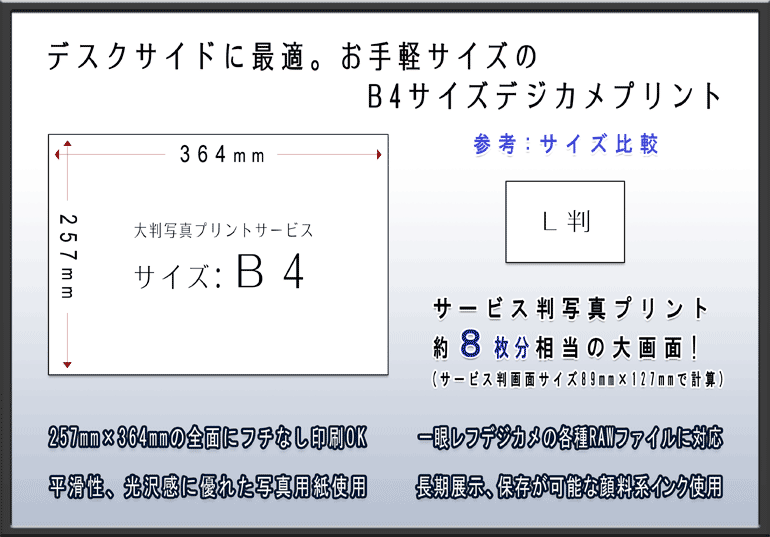 B4サイズ(257mm×364mm)の大判プリントサービスのご案内です。