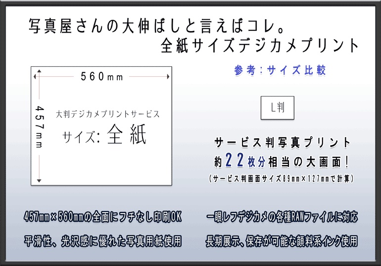 写真屋さんの大伸ばしといえばコレ。全紙サイズデジカメプリントサービスのご案内です。