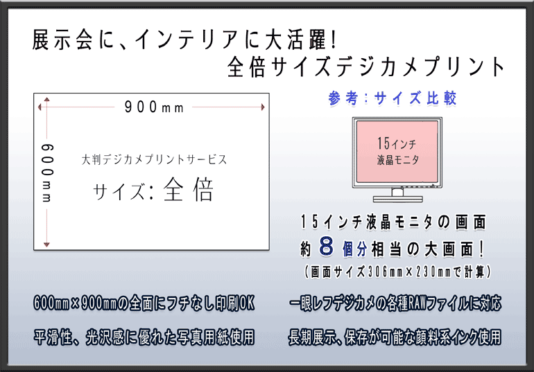 展示会に、インテリアにと大活躍の全倍サイズ(600mm×900mm)デジカメプリントサービスのご案内です。