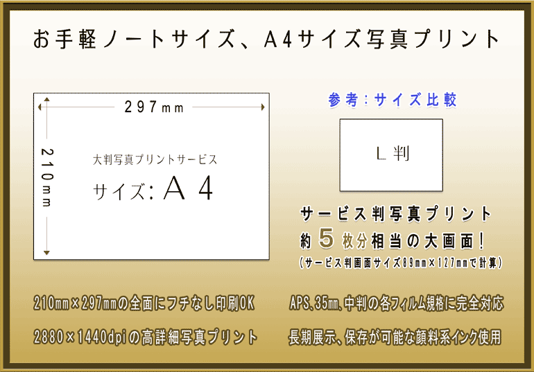 このページでは、A4サイズ(210mm×297mm)の大判写真プリントサービスをご案内します。 |