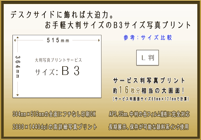 このページでは、B3サイズ(364mm×515mm)の大判プリントサービスをご案内します |