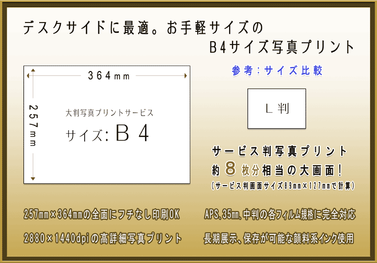 このページでは、B4サイズ(257mm×364mm)の大判プリントサービスをご案内します。 |