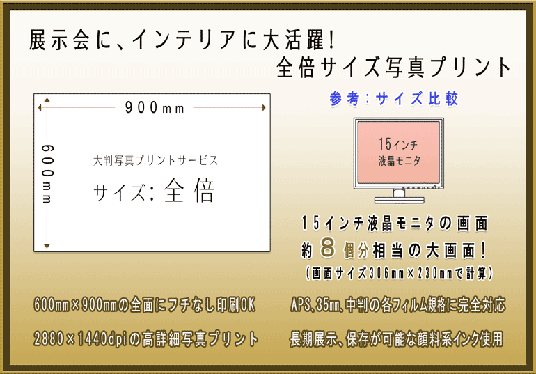 このページでは、全倍サイズ(600mm×900mm)の大判写真プリントサービスをご案内します |