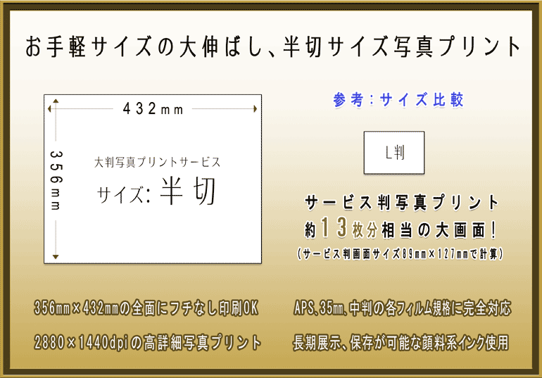このページでは、半切サイズ(356mm×432mm)の大判写真プリントサービスをご案内します。 |